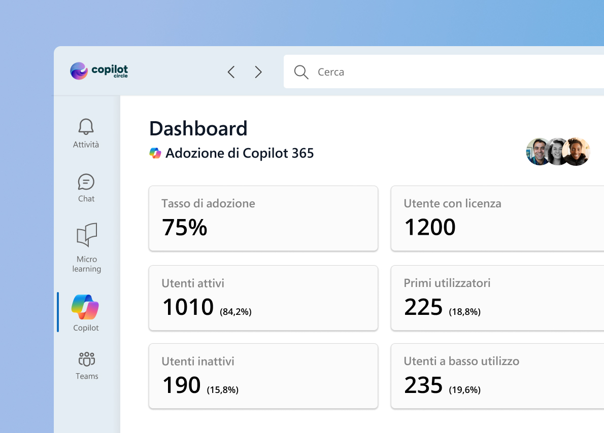Copilot Circle è una piattaforma AI che aiuta le organizzazioni a guidare la vera adozione di Microsoft Copilot. Combina un AI Agent intelligente che monitora l'utilizzo e classifica gli utenti, corsi di microlearning adattivi, una libreria di 600+ prompt e formazione live con esperti certificati — il tutto integrato nativamente in Microsoft 365.