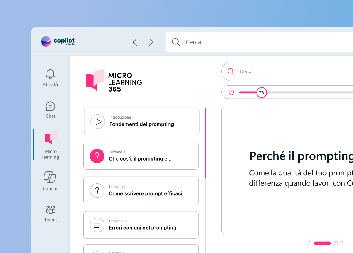 Oltre 150 casi d'uso e corsi e-learning con quiz e certificati, che coprono le basi di Copilot e la formazione specifica per dipartimento. Ogni corso si adatta al livello dell'utente.