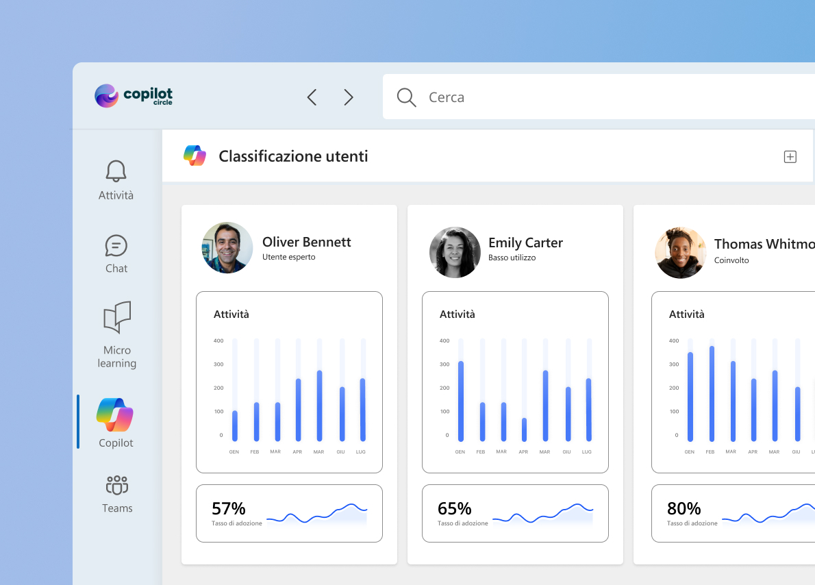 Un motore basato sull'intelligenza artificiale che classifica i tuoi utenti, fornisce i contenuti giusti e favorisce l'adozione — senza alcuno sforzo manuale. La piattaforma analizza il comportamento reale su Copilot e assegna a ciascun utente un profilo di adozione.